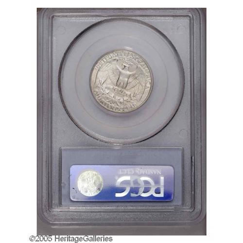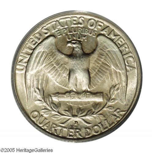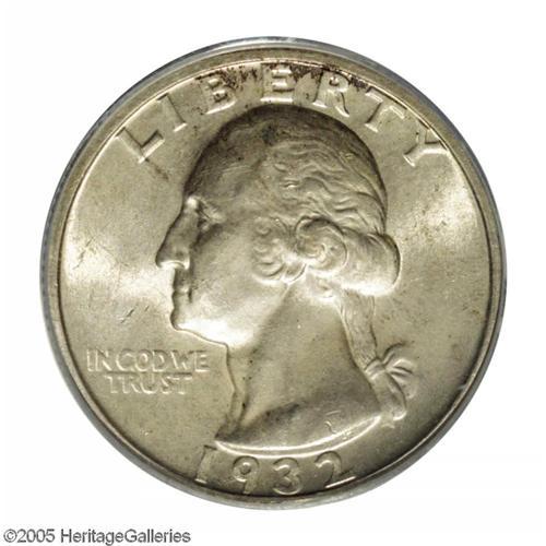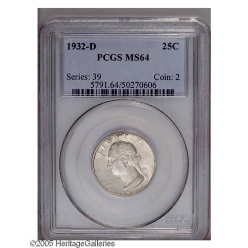 <B>1932-D<25C> MS64 PCGS.</B></I> A very sharp near-Gem key date '32-D quarter. The fully lustrous surfaces display subtle hints of gold-tan, powder-blue, and lilac patination under a glass. The design elements are well brought up, with nice definition apparent in Washington's hair and on the eagle's breast feathers. A few minor marks in the left (facing) obverse field and on Washington's cheek and neck define the grade. Population: 426 in 64, 64 finer (11/05).