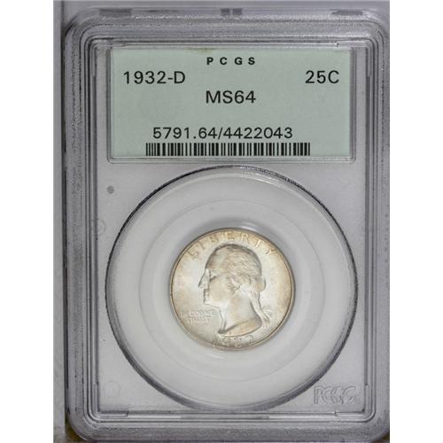 <B>1932-D<25C> MS64 PCGS.</B></I> Boldly struck with a dusting of golden patina on each side. With Gems being scarce and quite costly, the challenge is in finding an attractive example of this key issue in lesser grade. This frosty near-Gem certainly qualifies.