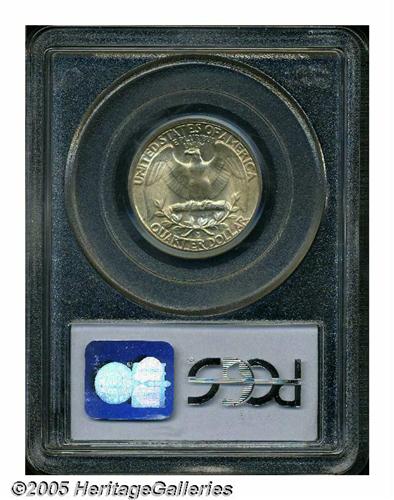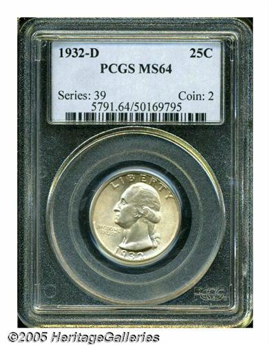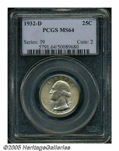 <B>1932-D<25C> MS64 PCGS.</B></I> Choice is always a good thing, and the Central States Sale gives the Washington Quarter collector several opportunities to select a high grade example of the key 1932-D. This is a particularly worthwhile coin that gives the collector excellent value for the dollar spent. The mint luster has a smooth, satiny texture and the striking details are especially strong on each side. A few tiny marks are present on the cheek of Washington, one reeding mark is located just in back of his receding hairline, and a couple of tiny abrasions are seen on the upper portion of his neck. All of these flaws are visible with a magnifier, but the unaided eye has a difficult time locating these imperfections. Light golden toning is seen equally over each side.
