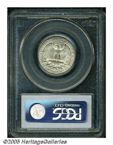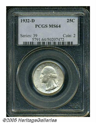 <B>1932-D<25C> MS64 PCGS.</B></I> Cream-gray, pink, and dappled charcoal colors grace this satiny key date Quarter. The fields are refreshingly devoid of contact, and only intense inspection locates a couple of tiny and well concealed marks on the obverse portrait. The continuing Statehood Quarter series continues to bring collectors to the earlier Washington type, and the demand for quality Mint State examples of the key 1932-D is much greater than the meager supply.
