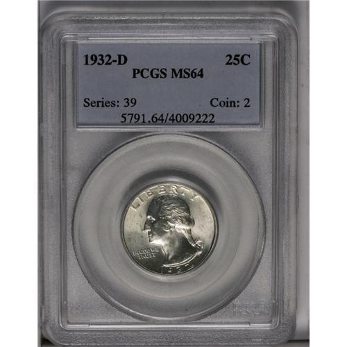 <B>1932-D<25C> MS64 PCGS.</B></I> For those who like their coins straight, this example features bold luster radiating from the untoned, silver-white surfaces that have just a glimmer of copper-gold color. The die polish near the date on this example is a diagnostic for one genuine D-mint die, as is the mintmark's squared serifs and its appearance of resting in a small depression. A few small abrasions on Washington's cheek and neck are noted, but they are undistracting.