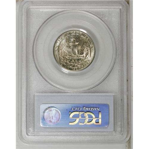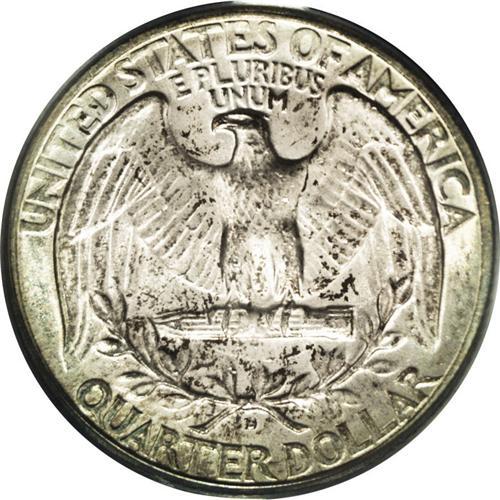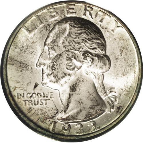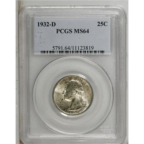 <B>1932-D<25C> MS64 PCGS.</B></I> For years, the 1932-D and 1932-S quarters, both key dates for the Washington quarter series, were at about the same price and level of interest. Paul Green, in an interesting article entitled "1932-S quarter losing ground to 1932-D" published in the March 14, 2006 issue of <I>Numismatic News,</B></I> notes that this has changed over time. He writes that: "...the higher mintage 1932-D (is) actually...tougher in higher grades than the 1932-S. Green continues: "...by MS60, the 1932-D is at $1,000, while the 1932-S is at $500....in MS65 the 1932-D is at $26,500, while the 1932-S is at $7,700." The near-Gem '32-D offered here displays radiant luster overlain with mottled cobalt-blue and purplish patina, and the design elements are exceptionally well struck. A few minute marks on the Washington and eagle motifs define the grade. PCGS has seen 64 pieces finer (3/06).