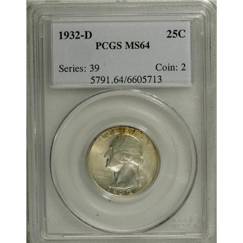 <B>1932-D 25C MS64 PCGS.</B></I> Hints of honey-gold toning visit the obverse at 12 o'clock and the reverse near the eagle's right (facing) wingtip. Surprisingly unabraded for the MS64 level, aside from a shallow mark on the eagle's upper right leg. The 1932-D has long been regarded as the key date to the entire series.<BR><BR><b>Shipping:</b> Coins & Currency (<a target="_blank" href="http://www.heritageauctions.com/common/shipping.php">view shipping information</a>)