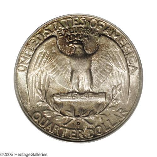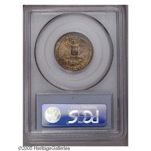 <B>1932-D<25C> MS64 PCGS.</B></I> Irregular antique-golden toning is splashed over both sides and mixes nicely with multicolored iridescence as the coin turns under a light. This is really quite a nice coin from the technical standpoint and if one finds the toning appealing, this could be a good buy for an astute collector.