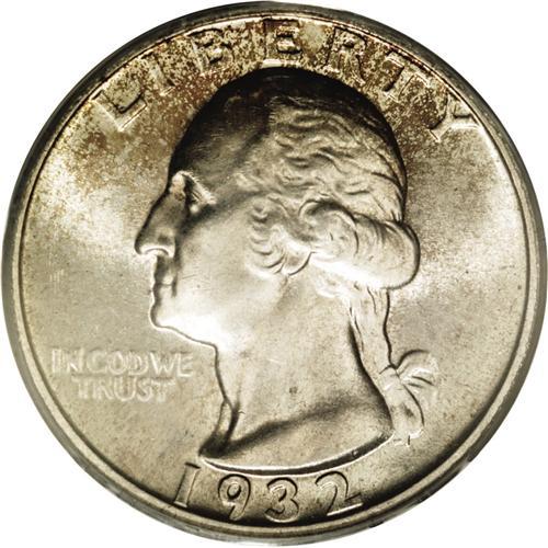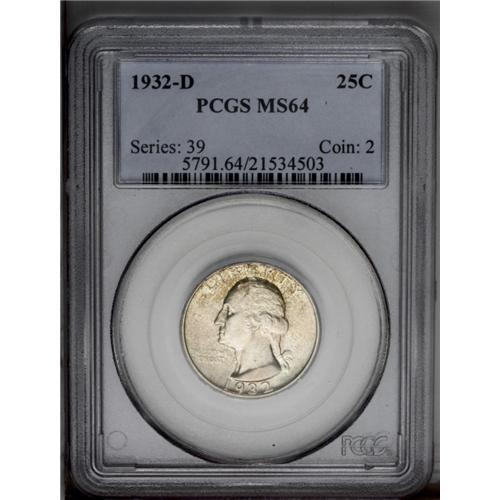<B>1932-D<25C> MS64 PCGS.</B></I> Long considered the key to the series, this Denver mint issue, with an original mintage of only 436,800 pieces, is easily located in circulated grades but becomes an important condition rarity at the Choice Uncirculated level. This piece has ample luster and a couple of minor abrasions that are consistent with the grade. Each side has milky-gray patina with hints of deep antique-gold mostly on the obverse. With pieces at the next grade level bringing in excess of five figures, the present coin seems like an excellent value for the money.<BR><I>Ex: David W. Lange; Michael Fey.</B></I>