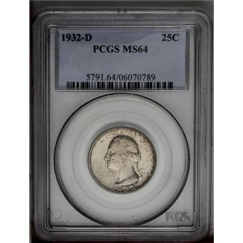 <B>1932-D<25C> MS64 PCGS.</B></I> Sharply detailed throughout with especially strong definition on Washington's hair. Each side shows original brilliance with flecks of russet toning scattered about the margins.