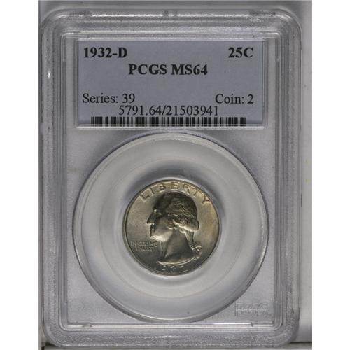 <B>1932-D<25C> MS64 PCGS.</B></I> The 1932-D and 1932-S are the twin towers of the Washington quarter series. Their mintages are only a fraction of that of their closest competitors. The 1932-D is believed scarcer in Mint State than the slightly lower production 1932-S, as confirmed by third party population figures. The present satiny tan-gray near-Gem is well preserved and assertively struck. It would be the highlight of most collections of the series.
