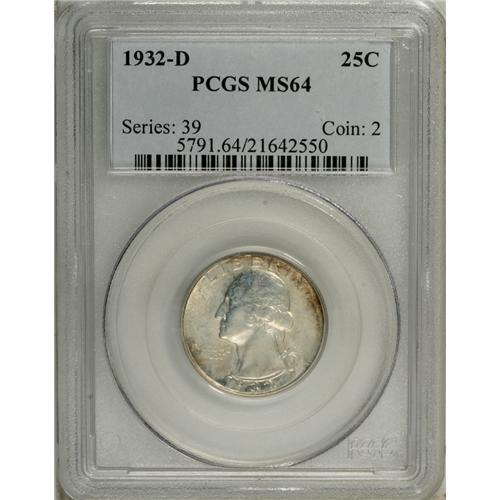 <B>1932-D 25C MS64 PCGS.</B></I> This near-Gem has satiny silver luster that is accented by hazy blue color and hints of light gold toning near the obverse border. The reverse is fully brilliant with a light ivory haze. A lovely piece with excellent aesthetic appeal and a market value considerably less than that of Gem pieces.<BR><BR><b>Shipping:</b> Coin/Currency (<a target="_blank" href="http://www.heritageauctions.com/common/shipping.php">view shipping information</a>)