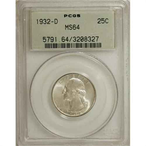<B>1932-D 25C MS64 PCGS.</B></I> Original blended pearl-gray and chestnut patina embraces satiny, boldly struck surfaces. There are a few pinpoint marks on the devices; nonetheless this is a handsome rendition of this desirable key date in the Washington quarter series. Certified in a prior generation, green label holder. <BR><BR><B>Coin Engraver:</B> John Flanagan<BR><BR><b>Shipping:</b> Coins & Currency (<a target="_blank" href="http://www.heritageauctions.com/common/shipping.php">view shipping information</a>\)