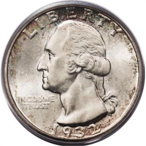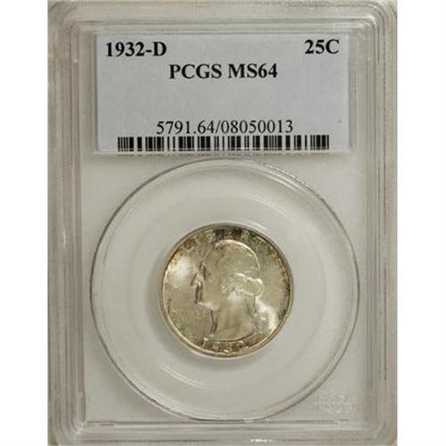 <B>1932-D 25C MS64 PCGS.</B></I> The scarcity and terrific jump in price that the 1932-D quarter takes from MS64 to MS65 makes near-Gem pieces such as this a terrific value. For approximately one-fourth of the price of a Gem, a coin can be obtained that is ever-so-close to full MS65 status. Much of the original brilliance remains on this piece with irregular patches of color around the margins. The only grade-limiting mark is in the left obverse field, a non-critical area of the coin. <BR><BR><B>Coin Engraver:</B> John Flanagan<BR><BR><b>Shipping:</b> Coins & Currency (<a target="_blank" href="http://www.heritageauctions.com/common/shipping.php">view shipping information</a>\)
