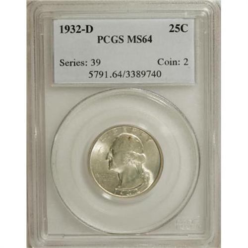 <B>1932-D 25C MS64 PCGS.</B></I> Along with the 1932-S, the 1932-D is a key date in the Washington quarter series. Writing in the February 9, 2004 issue of <I>Coin World</B></I>, Randy Campbell suggests some examples of this issue are weakly struck. This near-Gem specimen exhibits sharp design elements, as evidenced by the delineation in Washington's hair strands and most of the eagle's plumage. Highly lustrous surfaces are nearly untoned save for a splash of reddish-gold on the obverse and a wisp or two of light tan on the reverse. A few minor obverse marks define the grade.<BR><BR><B>Coin Engraver:</B> John Flanagan<BR><BR><b>Shipping:</b> Coins & Currency (<a target="_blank" href="http://www.heritageauctions.com/common/shipping.php">view shipping information</a>\)