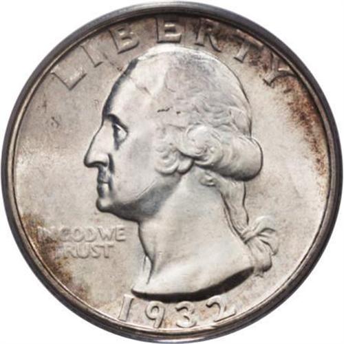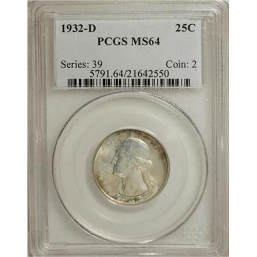 <B>1932-D 25C MS64 PCGS.</B></I> This near-Gem key-date representative has satiny silver luster that is accented by hazy blue color and hints of light gold toning near the obverse border. The reverse is fully brilliant with a light ivory haze. A sharp strike brings out excellent definition on the design elements, as evidenced by the strands in Washington's hair. A small linear mark is noted on the cheek. A lovely piece with excellent technical quality and aesthetic appeal. <BR><BR><B>Coin Engraver:</B> John Flanagan<BR><BR><b>Shipping:</b> Coins & Currency (<a target="_blank" href="http://www.heritageauctions.com/common/shipping.php">view shipping information</a>\)