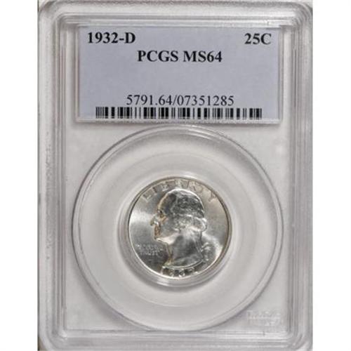 <B>1932-D 25C MS64 PCGS.</B></I> Only 436,800 pieces were struck of this key issue, and examples are eagerly sought by collectors in all grades. A high degree of satiny brilliance shines forth from each side of this flashy near-Gem. A few wispy marks and luster grazes are noted on the obverse, but they seem minimal for the assigned grade. Very near to Gem quality. <BR> Indeed, this specimen displays higher-quality attributes than most '32-Ds. In a February 2004 issue of <I>Coin World</B></I>, ANACS grader Randy Campbell wrote: "A large percentage of the surviving 1932-D quarters have been cleaned or improperly stored. Such examples will have poor to below average luster. Hairline scratches are a significant problem with this issue." This piece transcends all of these problems.<BR><I>From The New York Eye Appeal Collection, Part Three.</B></I><BR><BR><B>Coin Engraver:</B> John Flanagan<BR><BR><b>Shipping:</b> Coins & Currency (<a target="_blank" href="http://www.heritageauctions.com/common/shipping.php">view shipping information</a>)