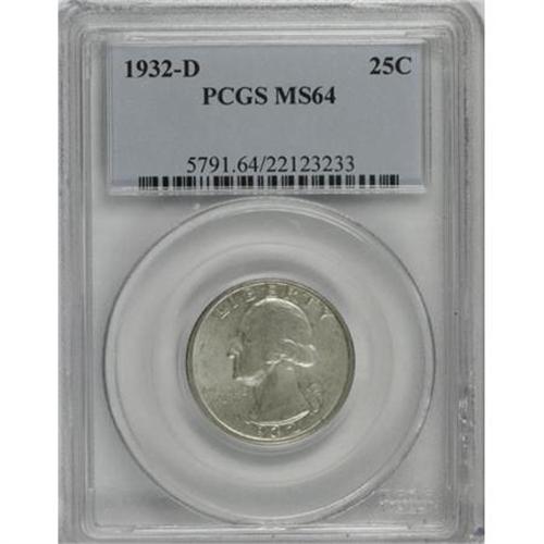 <B>1932-D 25C MS64 PCGS.</B></I> Champagne-gold patina imbued with hints of light blue grace the highly lustrous surfaces of this near-Gem key date. A well executed strike imparts sharp definition to the design elements. A few minute marks preclude Gem classification, but still an excellent fit for a Mint State collection.<BR><BR><B>Coin Engraver:</B> John Flanagan<BR><BR><b>Shipping:</b> Coins & Currency (<a target="_blank" href="http://www.heritageauctions.com/common/shipping.php">view shipping information</a>)