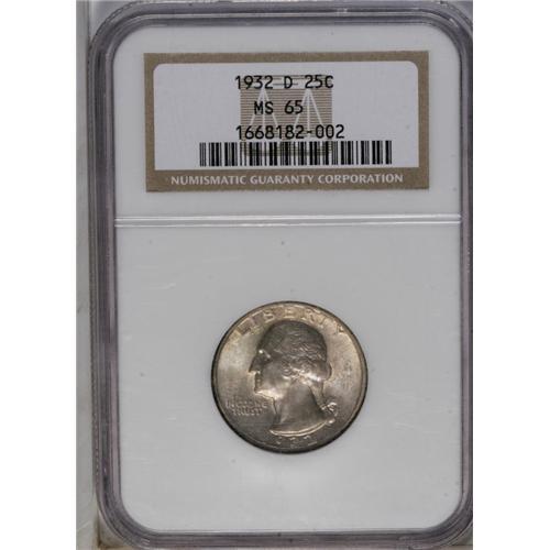 <B>1932-D<25C> MS65 NGC.</B></I> Although there are no major rarities in the Washington quarter series, the 1932-D and 1932-S issues are scarce in Mint State grades, and highly elusive in Gem quality. These coins were designed by John Flanagan, who was the artist chosen by Treasury Secretary Andrew Mellon, even though Laura Gardin Fraser won the actual design competition. Fraser is best known in numismatics as the designer of the Alabama, Grant, and Vancouver half dollars, as well as the Philippines coins honoring General Douglas MacArthur. She was the wife of James Earle Fraser of Buffalo nickel fame. John Flanagan was once a student of Augustus Saint-Gaudens and was a sculptor in New York City. The Washington quarter is his only coin design, although he was also commissioned for a few medallic issues.<BR> This lovely Gem quality example is sharply defined with attractive heather toning over frosty silver luster on the obverse. The reverse has light gold color with frosty luster also. The surfaces have a few tiny abrasions, mostly hidden in the devices, but these hardly detract.