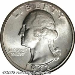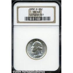 <B>1932-D 25C MS65 NGC.</B></I> The Denver Mint inaugurated Washington Quarter production in 1932 with a limited delivery of 436,800 pieces. Although the S-mint from this initial year was produced in smaller numbers, the '32-D has long been considered the more challenging coin to locate in Choice and better condition. Gems are of the utmost scarcity and importance. This high grade representative is untoned save for a few whispers of pale golden tinting here and there. The central devices are boldly detailed and the only abrasion of any consequence is located on Washington's neck. Population: 15 in 65, 0 finer (2/05).