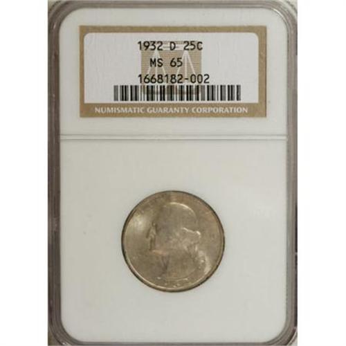 <B>1932-D 25C MS65 NGC.</B></I> Although there are no major rarities in the Washington quarter series, the 1932-D and 1932-S issues are scarce in Mint State grades, and highly elusive in Gem quality. These coins were designed by John Flanagan, who was the artist chosen by Treasury Secretary Andrew Mellon, even though Laura Gardin Fraser won the actual design competition. Fraser is best known in numismatics as the designer of the Alabama, Grant, and Vancouver half dollars, as well as the Philippines coins honoring General Douglas MacArthur. She was the wife of James Earle Fraser of Buffalo nickel fame. John Flanagan was once a student of Augustus Saint-Gaudens and was a sculptor in New York City. The Washington quarter is his only coin design, although he was also commissioned for a few medallic issues.<BR> This lovely Gem quality example is sharply defined with attractive heather toning over frosty silver luster on the obverse. The reverse has light gold color with frosty luster also. The surfaces have a few tiny marks, mostly hidden in the devices, but these hardly detract. Census: 16 in 65, 0 finer (7/07).<BR><BR><B>Coin Engraver:</B> John Flanagan<BR><BR><b>Shipping:</b> Coins & Currency (<a target="_blank" href="http://www.heritageauctions.com/common/shipping.php">view shipping information</a>\)