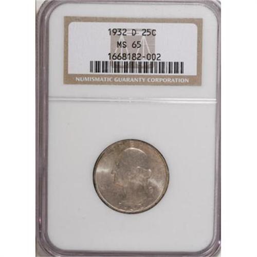 <B>1932-D 25C MS65 NGC.</B></I> Although there are no major rarities in the Washington quarter series, the 1932-D and 1932-S issues are scarce in Mint State grades, and highly elusive in Gem quality. These coins were designed by John Flanagan, who was the artist chosen by Treasury Secretary Andrew Mellon, even though Laura Gardin Fraser won the actual design competition. Fraser is best known in numismatics as the designer of the Alabama, Grant, and Vancouver half dollars, as well as the Philippines coins honoring General Douglas MacArthur. She was the wife of James Earle Fraser of Buffalo nickel fame. John Flanagan was once a student of Augustus Saint-Gaudens and was a sculptor in New York City. The Washington quarter is his only coin design, although he was also commissioned for a few medallic issues.<BR> This lovely Gem quality example is sharply defined with attractive heather toning over frosty silver luster on the obverse. The reverse has light gold color with frosty luster also. The surfaces have a few tiny marks, mostly hidden in the devices, but these hardly detract. Census: 16 in 65, 0 finer (12/07).<BR><BR><B>Coin Engraver:</B> John Flanagan<BR><BR><b>Shipping:</b> Coins & Currency (<a target="_blank" href="http://www.heritageauctions.com/common/shipping.php">view shipping information</a>)