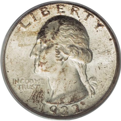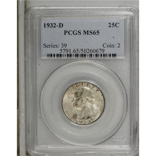 <B>1932-D 25C MS65 PCGS.</B></I> Original silver-gray surfaces intermingle with blushes of golden-brown and apple-green toning. Satin luster is unbroken throughout both sides, and contact is quite minimal; a small mark on the upper left area of the eagle's breast is mentioned solely for pedigree purposes. The strike is bold, not only on the highpoints of the devices, but also across the legends near the rim. Only the lowest portion of the date is not sharp, and few collectors would even notice this feature. In short, this is a remarkable example of this coveted first-year issue, the unchallenged key to the series in Gem condition. Since NGC and PCGS combined have certified only one piece finer, the present coin represents the finest realistically obtainable quality, and would provide the cornerstone of a standout collection of the series. Population: 63 in 65, 1 finer (2/07).<BR><BR><b>Shipping:</b> Coins & Currency (<a target="_blank" href="http://www.heritageauctions.com/common/shipping.php">view shipping information</a>)