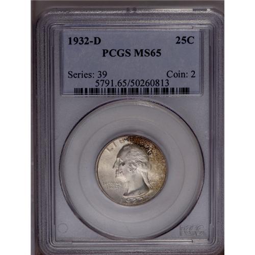 <B>1932-D<25C> MS65 PCGS.</B></I> The undisputed key to the Washington quarter series, this is a coin that must be seen to be believed. While not technically perfect (there are a couple of minor abrasions on the obverse), the surfaces are original and very attractively toned. Each side displays light amounts of golden, russet, and dove-gray toning with strong underlying mint frost. An exceptional '32-D that should be of interest to many collectors of this modern series. Census: 14 in 65, 0 finer (2/06).