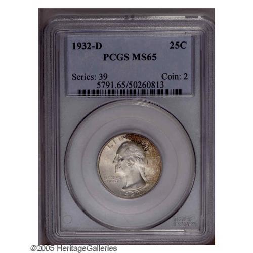 <B>1932-D<25C> MS65 PCGS.</B></I> The undisputed key to the Washington Quarter series, this is a coin that must be seen to be believed. While not technically perfect (there are a couple of minor abrasions on the obverse), the surfaces are original and very attractively toned. Each side displays light amounts of golden, russet, and dove-gray toning with strong underlying mint frost. An exceptional '32-D that should be of interest to many collectors of this modern series. Population: 63 in 65, 1 finer (10/05).