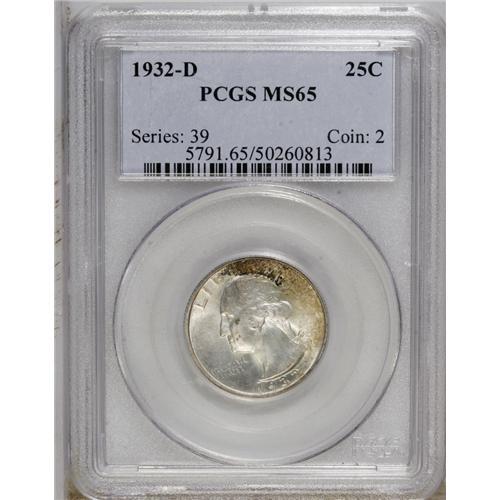 <B>1932-D<25C> MS65 PCGS.</B></I> The undisputed key to the Washington quarter series, this is a coin that must be seen to be fully appreciated. While not technically perfect (there are a couple of minor abrasions on the obverse), the surfaces are original and attractively toned. The upper right portion of the obverse displays light golden, russet, and dove-gray toning with strong underlying mint frost. This is an exceptional '32-D that should be of interest to a wide variety of collectors of this modern series. Population: 63 in 65, 1 finer (9/06).