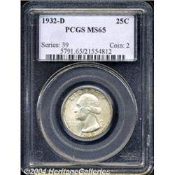 <B>1932-D<25C> MS65 PCGS.</B></I> An original example of this conditionally rare, key date Washington Quarter. Obviously well taken care of since the year of issue, the coin has been left to tone naturally, and as a result has taken on a light gray shade with some scattered russet accents at selected border areas. There are no singularly mentionable abrasions on either side of this impressive coin. Population: 47 in 65, 1 finer (3/04). <BR><BR><B>Important notice:</B> Heritage usually auctions material at the rate of 200-250 lots per hour. On some occasions eBay Live bid software or the Internet may not be able to keep up with the pace of the auction. We recommend placing a realistic absentee bid now as insurance to avoid disappointment. Occasionally the auctioneer may eliminate or reject an eBay Live bid, and the auctioneer may also reopen a lot after the close of the eBay live bidding (usually because we missed an audience bid), and may reject your bid even if it shows you as the winning bidder. By bidding via eBay Live, you agree that Heritage may award the lot to another bidder at its sole discretion under the circumstances described above or any other reasonable circumstances. Since eBay bids are not shown to us until we open the lot on the floor, we treat those bids just like floor bids. In most cases the floor responds before the eBay bid is presented to us, due to Internet lag time, so for consistency we have made it a policy that floor bids are always considered first over tie eBay live bids. Also please note that all Heritage lots purchased through eBay Live carry a 20% Buyer's Premium. Please make sure you read the Terms and Conditions before you bid. </span></font></tr></table></td></tr></table>