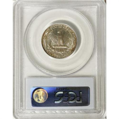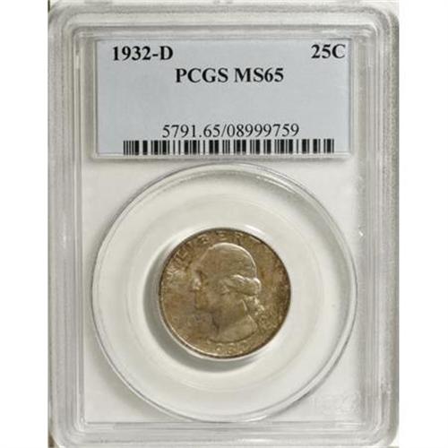 <B>1932-D 25C MS65 PCGS.</B></I> Study of the evolution of the Washington quarter demonstrates how coin designs are seldom (ever?) a straight line from concept to finished product. The Washington design was originally intended for the half dollar. Congress intervened and changed it to a quarter. The winning design was to be chosen from entrants submitted to the Commission of Fine Arts. Instead, Treasury Secretary Andrew W. Mellon chose the design he wanted. At least the coin was issued on the bicentennial of Washington's birth, and the design is based on the Houdon bust of the first president.<BR> The low-mintage 1932-D is rarely offered in Gem condition. This is a lovely, lustrous example that has speckled iridescent toning over the obverse. The reverse is mostly brilliant in the center with the same iridescence around the margin. An outstanding '32-D quarter. Population: 63 in 65, 1 finer (8/07).<BR><BR><B>Coin Engraver:</B> John Flanagan<BR><BR><b>Shipping:</b> Coins & Currency (<a target="_blank" href="http://www.heritageauctions.com/common/shipping.php">view shipping information</a>)