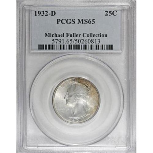 <B>1932-D 25C MS65 PCGS.</B></I> Ex: Michael Fuller Collection. The undisputed key to the Washington quarter series, this is a coin that must be seen to be fully appreciated. While not technically perfect (there are a handful of minor contact marks on the obverse), the surfaces are original and attractively toned. The upper right portion of the obverse displays light golden, russet, and dove-gray toning, and both sides exhibit strong mint frost. This is an exceptional '32-D that should be of interest to a wide variety of collectors of this modern series. Population: 62 in 65, 1 finer (10/07).<BR><I>From The Michael Fuller Collection.</B></I><BR><BR><B>Coin Engraver:</B> John Flanagan<BR><BR><b>Shipping:</b> Coins & Currency (<a target="_blank" href="http://www.heritageauctions.com/common/shipping.php">view shipping information</a>)