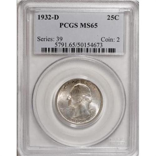 <B>1932-D 25C MS65 PCGS.</B></I> The Denver Mint inaugurated Washington quarter production in 1932 with a limited mintage of 436,800 pieces. Although the S-mint from this initial year was produced in smaller numbers, the '32-D has long been considered the more challenging coin to locate in Choice and better condition. Gems are of the utmost scarcity and importance. This high grade representative is untoned save for a few whispers of charcoal tinting at the top of the obverse, and the devices are boldly detailed. A few minute obverse marks preclude an even higher grade. Population: 62 in 65, 1 finer (11/07).<BR><BR><B>Coin Engraver:</B> John Flanagan<BR><BR><b>Shipping:</b> Coins & Currency (<a target="_blank" href="http://www.heritageauctions.com/common/shipping.php">view shipping information</a>)