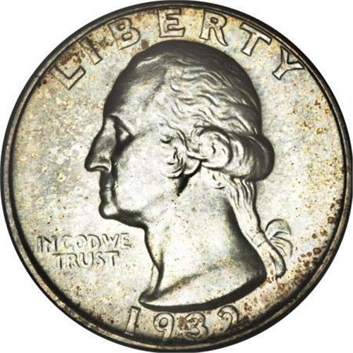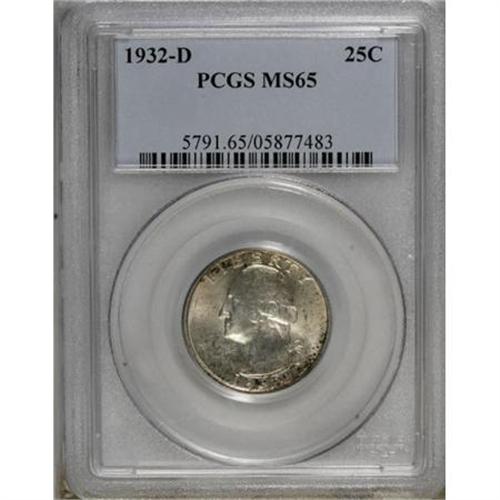 <B>1932-D 25C MS65 PCGS.</B></I> Considered the key date in the Washington quarter series, from a mintage of 436,800 coins, second lowest in the series behind the 408,000 examples coined in San Francisco the same year. Both issues are quite rare in Gem Mint State. In fact, PCGS has only graded one coin any finer than this example.<BR> A lovely piece, exhibiting satiny silver brilliance with speckles of gold and iridescent toning. The strike is exceptional, with every detail boldly rendered. The few evident surface marks are entirely inconsequential. Population: 63 in 65, 1 finer (1/08).<BR><BR><B>Coin Engraver:</B> John Flanagan<BR><BR><b>Shipping:</b> Coins & Currency (<a target="_blank" href="http://www.heritageauctions.com/common/shipping.php">view shipping information</a>)