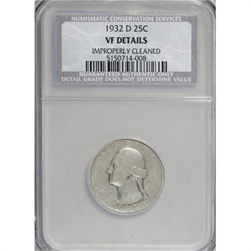 <B>1932-D 25C --Improperly Cleaned--NCS. VF Details.</B></I> NGC Census: (0/0). PCGS Population (0/0). Mintage: 436,800. (#5791)<BR><BR><B>Coin Engraver:</B> John Flanagan<BR><BR><b>Shipping:</b> Coins & Currency (<a target="_blank" href="http://www.heritageauctions.com/common/shipping.php">view shipping information</a>)