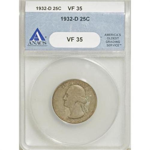 <B>1932-D 25C VF35 ANACS.</B></I> PCGS Population (39/2617). NGC Census: (33/1519). Mintage: 436,800. Numismedia Wsl. Price for NGC/PCGS coin in VF35: $250. (#5791)<BR><BR><B>Coin Engraver:</B> John Flanagan<BR><BR><b>Shipping:</b> Coins & Currency (<a target="_blank" href="http://www.heritageauctions.com/common/shipping.php">view shipping information</a>)
