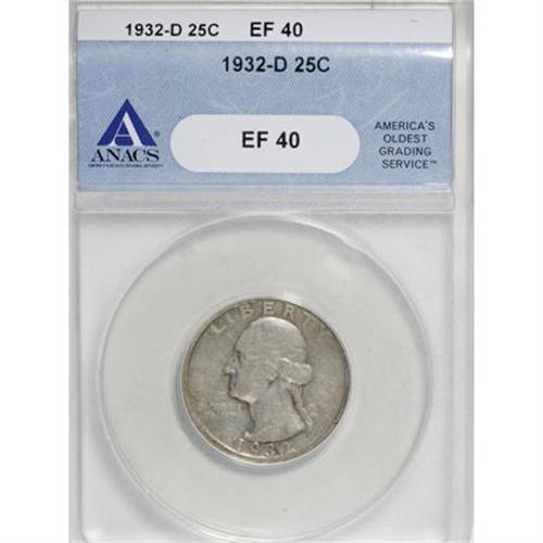 <B>1932-D 25C XF40 ANACS.</B></I> . NGC Census: (37/1510). PCGS Population (89/2582). Mintage: 436,800. Numismedia Wsl. Price for NGC/PCGS coin in XF40: $290. (#5791)<BR><BR><B>Coin Engraver:</B> John Flanagan<BR><BR><b>Shipping:</b> Coins & Currency (<a target="_blank" href="http://www.heritageauctions.com/common/shipping.php">view shipping information</a>)