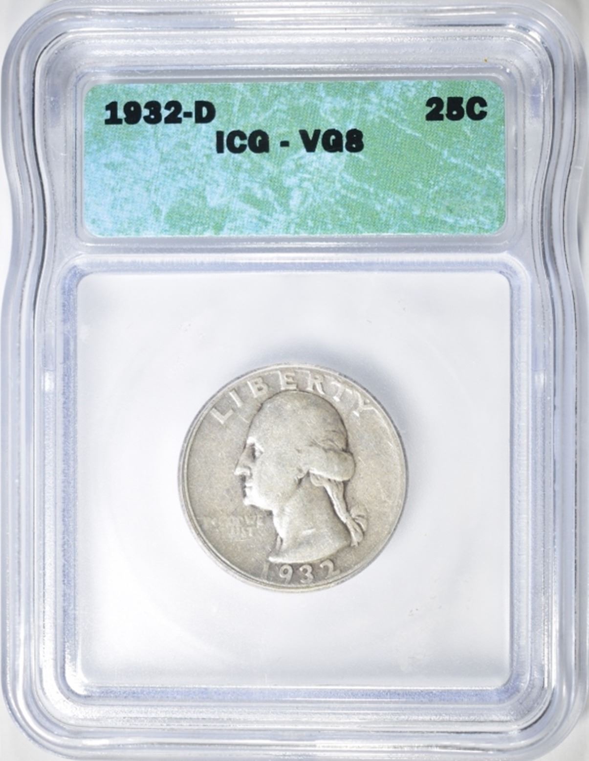 1932-D WASHINGTON QUARTER, ICG VG-8 KEY DATE
