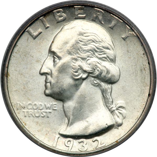 1932-D Washington Quarter Dollar. PCGS graded MS-64. Mostly white with a hint of tone here and there. A popular key date. Although collectors in the East stashed away the new 1932 Washington Quarters when they were first released, this seems not to have happened in the case of D-mint and S-mint coins in their respective circulating areas. Today, the 1932-D is considered a key in the Washington Quarter Dollar series. This is a very choice specimen, almost a gem (PCGS # 5791) .