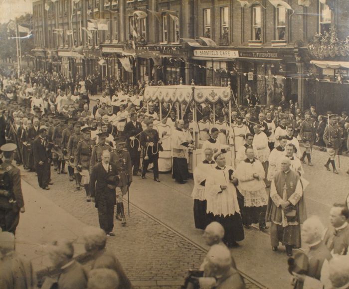 Collection of large photographs of the 1932 Dublin Eucharistic Congress. Scenes including mass on O'Connell Bridge, processions and events. Good clear images. All on stretchers for framing (9 items)