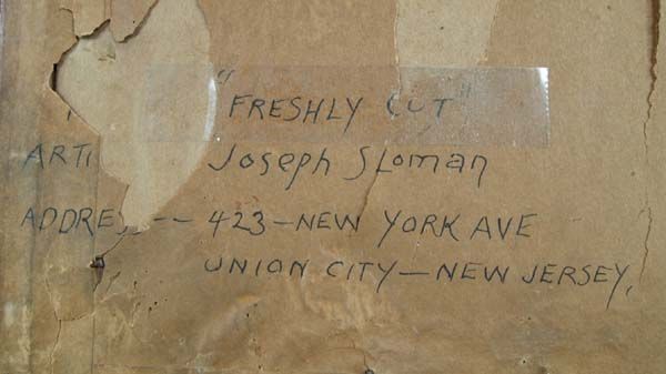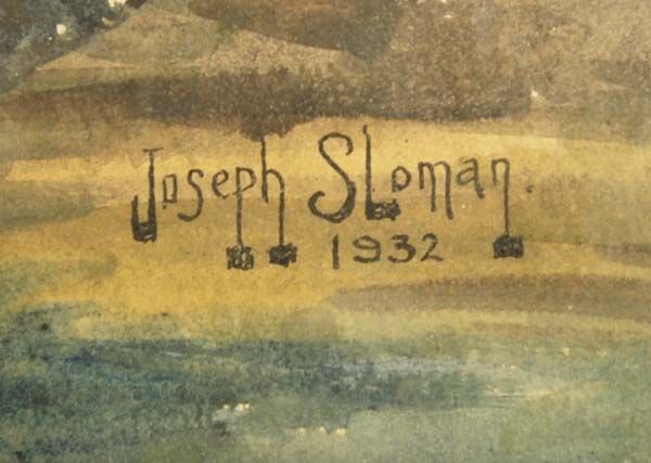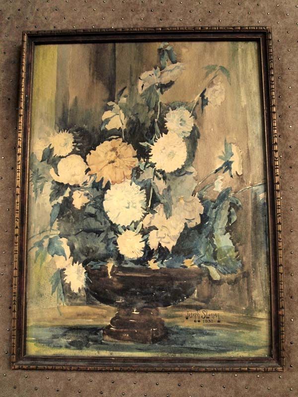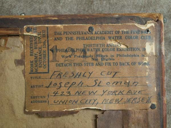 1932 Framed Watercolor ''Freshly Cut''-Joseph Sloman. Your grandmother's vase could be the subject here in this vintage watercolor by New Jersey artist, Joseph Sloman. Signed and dated on lower right corner. In wood frame, under glass. The title & artist's name is written on the back. Visual measures 19.5''x14.5''.