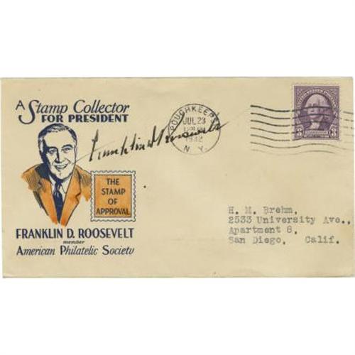 <B>Franklin Roosevelt 1932 Presidential Campaign Souvenir Cover Signed</B></I> <I>Franklin D. Roosevelt</B></I>. 6 x 3.5, postmarked July 23, 1932, Poughkeepsie, New York. Roosevelt, himself a stamp collector, gets the nod from the American Philatelic Society by way of this attractive first day cover. Fine. <BR><BR><b>Shipping:</b> Flat Material, Small (<a target="_blank" href="http://www.heritageauctions.com/common/shipping.php">view shipping information</a>)