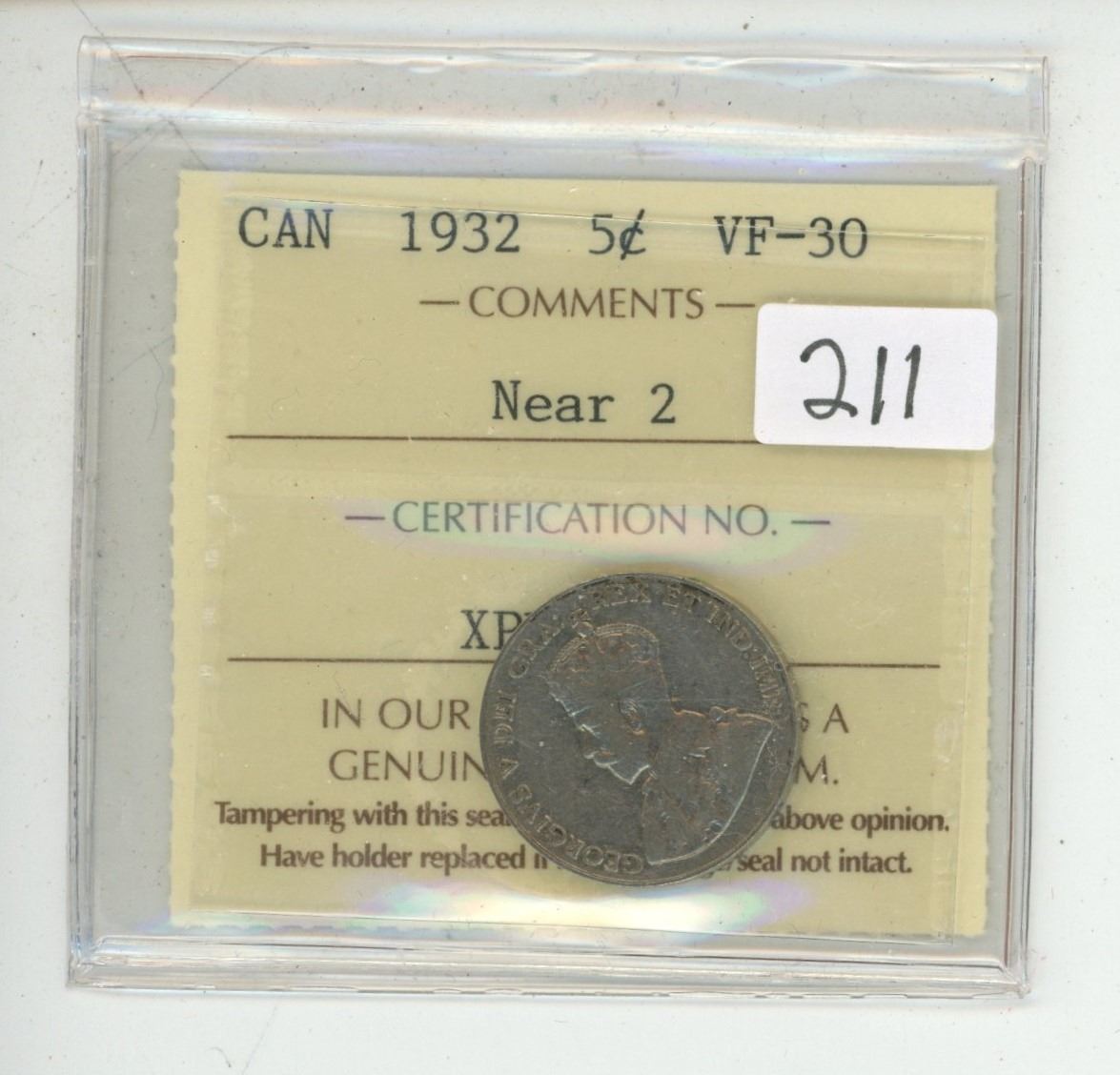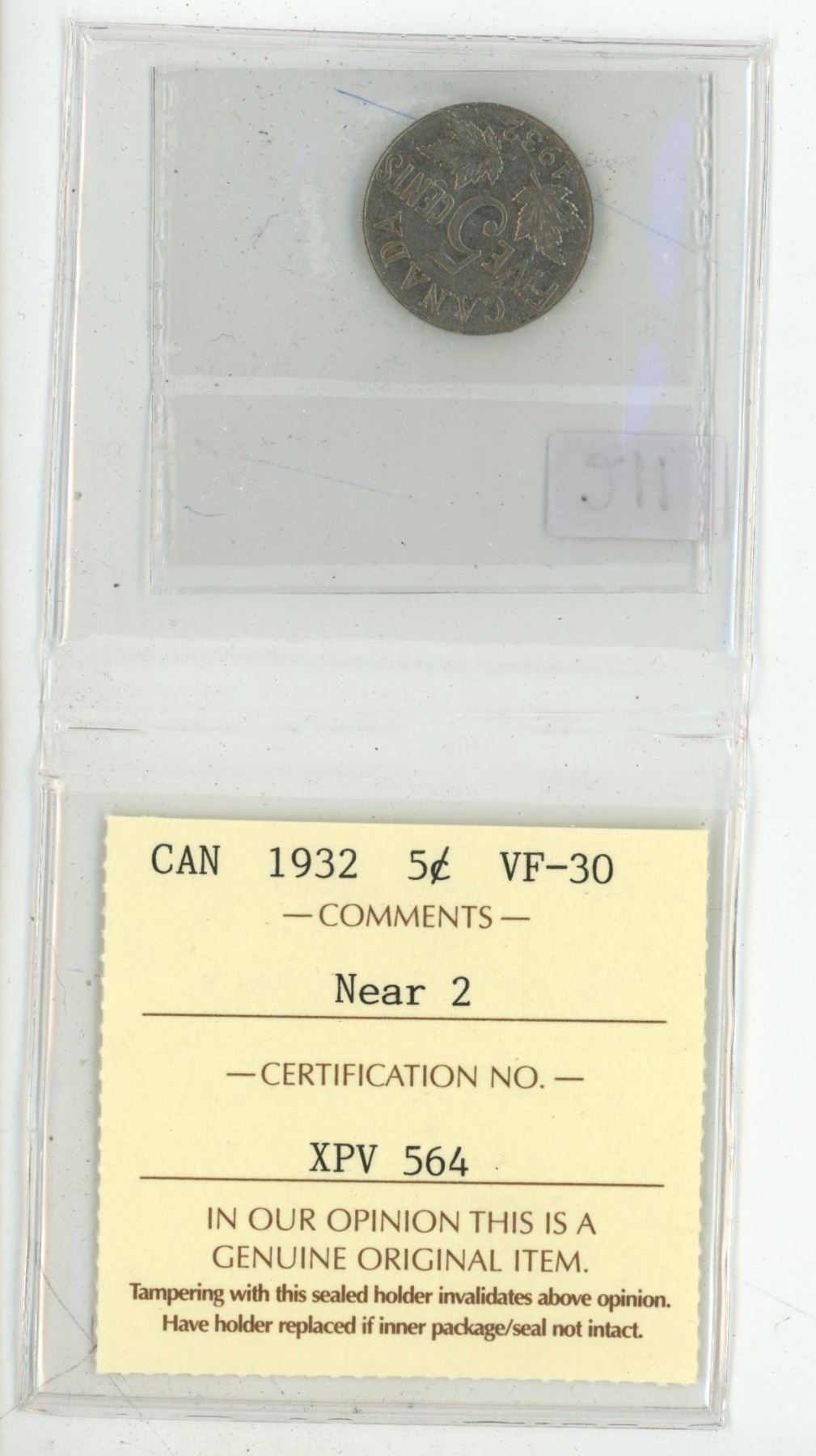 1932 ICCS graded, Canadian 5 cent coin - VF30