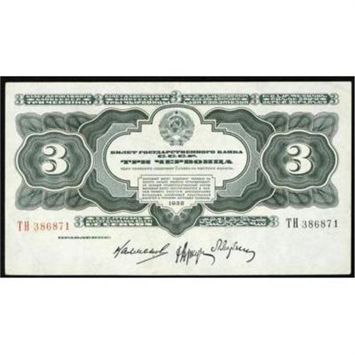 <style type="text/css"> body, td, th { font-family: Arial, Helvetica, sans-serif; font-size: 12px; color: #482424; margin: 0px; padding: 0px; } #header { background-image: url(http://www.bowersandmerena.com/ebay/images/template_v3_01.gif); clear: both; background-color: #590303; border-top-width: 2px; border-top-style: solid; border-top-color: #B38C4F; } #header #header_wrapper { height: 75px; clear: both; width: 800px; margin-right: auto; margin-left: auto; background-image: url(http://www.bowersandmerena.com/ebay/images/template_v3_03.gif); background-repeat: no-repeat; background-position: right; color: #F3EDCC; } #header #header_wrapper #header_logo { float: left; height: 75px; width: 444px; background-image: url(http://www.bowersandmerena.com/ebay/images/template_v3_02.gif); background-repeat: no-repeat; font-size: 10px; text-transform: capitalize; color: #B38C4F; } #header #header_wrapper #header_right { float: left; height: 75px; width: 356px; text-align: right; } #header #header_wrapper #header_right #headerLoginBtn { margin-bottom: 30px; } #header #header_wrapper #header_right input#txtSearch { color: #B49056; border: 1px solid #B49056; width: 175px; padding-top: 3px; padding-right: 3px; padding-bottom: 4px; padding-left: 3px; } #nav { height: 37px; background-image: url(http://www.bowersandmerena.com/ebay/images/template_v3_05.gif); clear: both; } #nav #nav_wrapper { height: 35px; width: 800px; margin-right: auto; margin-left: auto; border-left-width: 1px; border-left-style: solid; border-left-color: #B38C4F; } #nav #nav_wrapper a { padding-right: 15px; padding-left: 15px; border-right-width: 1px; border-right-style: solid; border-right-color: #B38C4F; height: 25px; padding-top: 10px; display: block; float: left; text-decoration: none; font-weight: bold; color: #5D0303; } #nav #nav_wrapper a:hover { color: #B38C4F; } #nav #nav_wrapper #search { float: right; padding-top: 7px; } #nav #nav_wrapper #search #txtSearch { font-family: Arial, Helvetica, sans-serif; font-size: 10px; text-transform: uppercase; color: #D2AE75; border: 1px solid #B38C4F; padding: 3px; } #content_bgd { background-image: url(http://www.bowersandmerena.com/ebay/images/template_v3_09.gif); background-repeat: repeat-y; background-position: center; padding-top: 15px; padding-bottom: 15px; background-color: #FBFBDB; } #content_wrapper { clear: both; height: auto; width: 800px; margin-right: auto; margin-left: auto; } .LotDetailWhite { line-height:normal; font-size:13px; font-family: arial,helvetica,sans-serif; color: White; font-weight: bold; } .LotDetailInformation { line-height:normal; font-size: 13px; font-family: arial,helvetica,sans-serif; } .LotDetailMessage { line-height:normal; font-size: 13px; font-family: arial,helvetica,sans-serif; color: red; } } tr.HeaderAuctionTitle td { color: #000000; font-weight: bold; padding: 2px; background-image: url(http://www.bowersandmerena.com/ebay/images/template_v3_05.gif); background-repeat: repeat-x; border-bottom-width: 1px; border-bottom-style: solid; border-bottom-color: #B38C4F; } table.AuctionSummary a, table.AuctionSummary a:link, table.AuctionSummary a:visited { color: #0000FF; text-decoration: none; } } td.tableHeaderLeft { border-left-width: 1px; border-left-style: solid; border-left-color: #B38C4F; } td.tableHeaderRight { border-right-width: 1px; border-right-style: solid; border-right-color: #B38C4F; } td.tableCellMiddle { border-left-width: 1px; border-left-style: solid; border-left-color: #B38C4F; border-right-width: 1px; border-right-style: solid; border-right-color: #B38C4F; padding: 5px; } tr.footer td { border-top-width: 1px; border-top-style: solid; border-top-color: #B38C4F; } </style> </head> <body> <div id="header"> <div id="header_wrapper"> <div id="header_logo"> </div> <div id="header_right"> </div> </div> </div> <div id="nav"> <div id="nav_wrapper"> <a href="http://www.bowersandmerena.com">Our eBayLive Auctions</a> <a href="#PaymentInfo">Payment Information</a> <a href="#ShippingInfo">Shipping Information</a> <a href="#About">About Bowers and Merena</a> </div> </div> <div id="content_bgd"> <div id="content_wrapper"> <table width="100%" border="0" cellpadding="5" cellspacing="0" class="AuctionSummary"> <tbody> <tr class="HeaderAuctionTitle" style="height: 25px;"> <td align="left" class="tableHeaderLeft" > </td> <td align="center" class="tableHeaderRight"> <span style="font-size: large;">Lot #2657. U.S.S.R. 1932 Issue.</span> </td> </tr> <tr> <td colspan="3" class="tableCellMiddle"> Lot of 2 different notes. Both are 1932, 3 Chervontsa, P-201, in XF to AU condition, green with arms at center.