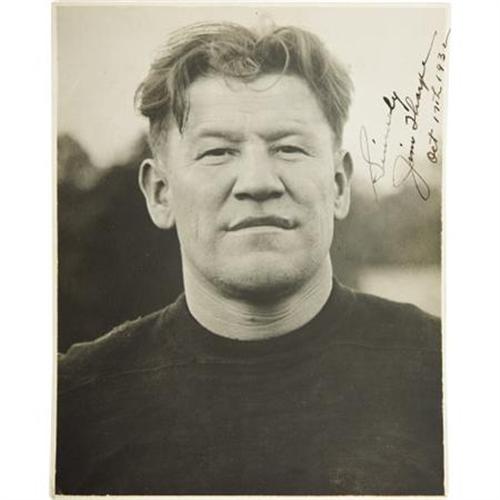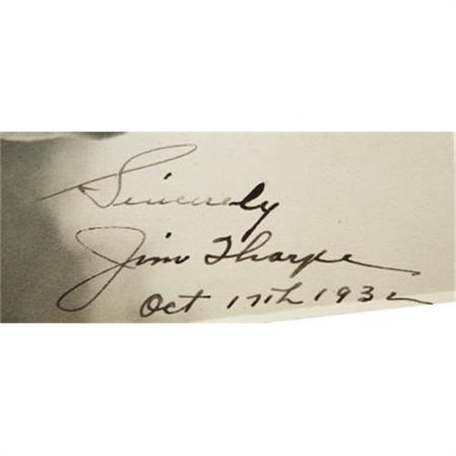 <B>1932 Jim Thorpe Signed Photograph.</B></I> Former President Dwight D. Eisenhower, whose own leg was broken by the Native American sporting legend in a 1912 gridiron meeting between Army and the Carlisle Indian School, recalled Thorpe in a 1961 speech, saying, "Here and there, there are some people who are supremely endowed. My memory goes back to Jim Thorpe. He never practiced in his life, and he could do anything better than any other football player I ever saw." Here we present the finest photographic portrait we've encountered of this gifted superstar, printed with crystal clarity to a size of 8x10". At right, the subject signs in 9+/10 black ink, "Sincerely, Jim Thorpe, Oct. 17th, 1932." The photo is likewise in flawless condition, sporting a lengthy handwritten biography of Thorpe on verso, seemingly in the hand of the photographer. A majestic piece of the highest quality. <I>LOA from PSA/DNA. LOA from James Spence Authentication.</B></I><BR><BR><b>Shipping:</b> Flat Material, Small (<a target="_blank" href="http://www.heritageauctions.com/common/shipping.php">view shipping information</a>)