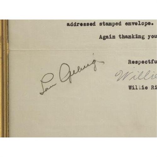 <B>1932 Lou Gehrig Signed Autograph Request Letter.</B></I> Mailed from San Francisco on September 6, 1932, this letter was likely waiting for the Yankee legend upon his return from a lengthy road trip that saw Gehrig club a grand slam and drive in four more runs in a fourteen-inning loss to the Detroit Tigers. The charming letter is typed upon the letterhead of the young collector's father, and reads, "Dear Mr. Gehrig: Will you kindly honor me with your signature to add to my collection of autographs from famous sporting men? I assure you that I will be very happy if you will grant me this priviledge (sic) and enclosed please find a return addressed stamped envelope. Again thanking you and wishing much luck, I am Respectfully yours, Willie Ritchie Jr." Besides young Willie's closing signature the Iron Horse provides his own, remaining in fine 9+/10 pencil three quarters of a century later. The letter is likewise in fine condition, with only original mailing folds to note, and is expensively matted and framed with a marvelous modern print of a batting portrait and an engraved plaque supplying a brief Gehrig biography. Total dimensions 26x28". <I>LOA from PSA/DNA. LOA from James Spence Authentication.</B></I><BR><BR><b>Shipping:</b> Framed - with Glass, Medium (<a target="_blank" href="http://www.heritageauctions.com/common/shipping.php">view shipping information</a>)