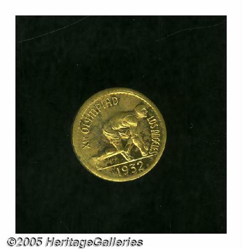 <B>1932<MS> Gold Olympics Medallion MS63 Uncertified.</B></I> Gold alloy, 13mm. An attractive round medallion, the obverse features a sprinter and the legends XTH OLYMPIAD LOS ANGELES, the reverse has a bear walking right surrounded on both sides by a wreath subsection, the legends CALIFORNIA GOLD 1/2 is centered above.