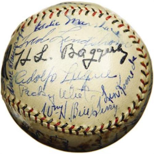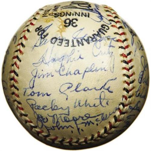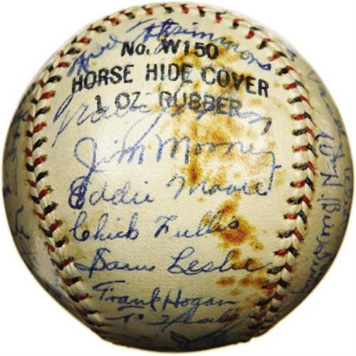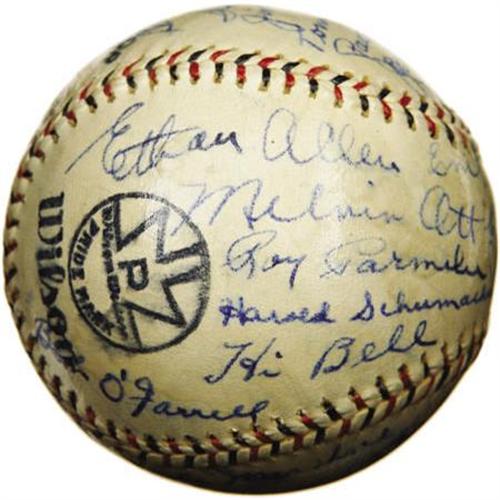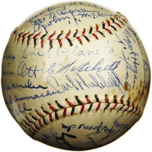 <B>1932 New York Giants Team Signed Baseball with Ott, McGraw.</B></I> Essentially the same ballclub that would defeat the Washington Senators the following season to claim the World Series title, one notable departure from that club two months into the 1932 season makes this offering arguably even more desirable than a Championship sphere. After thirty-one years at the helm of the New York Giants, the great John McGraw would turn over control to Bill Terry, ending one of the longest and most successful managerial tenures in the game's history. Clearly this "Pacific Coast League" sphere predates McGraw's June 3, 1932 resignation, as he appears as one of the thirty-three ultra-high grade autographs that coat the ball's surface. Also appearing in 9+/10 blue ink are Ott (signing with his full "Melvin" name), Hubbell, Lindstrom, Terry, Bancroft, Travis Jackson, Fitzsimmons, Luque, Moore, Marshall, Critz and Hogan. A patch of foxing upon one panel does nothing to undermine the strength of the autographs with which it shares space, and a few fingerprints dabbed the wet ink on occasion, likewise to no significant effect. A coating of shellac has remained perfectly clear and has served its intended purpose marvelously. Almost assuredly the highest quality sphere in the hobby to boast the full contingent of Depression-era Hall of Fame Giants, this is one for the collector who demands nothing but the best. <I>LOA from PSA/DNA. LOA from James Spence Authentication.</B></I><BR><BR><b>Shipping:</b> Balls, Pucks, etc., Small (<a target="_blank" href="http://www.heritageauctions.com/common/shipping.php">view shipping information</a>)