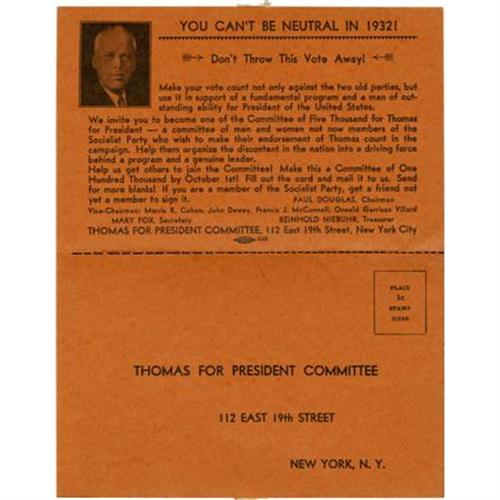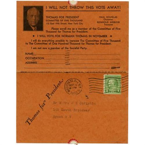 <B>1932 Norman Thomas Socialist Party Presidential Campaign Postcard,</B></I> 5.5” x 3.5”, double card with perforation. Used, else very fine. <B></B></I><BR><BR><b>Shipping:</b> Miscellaneous Collectibles, Smal (<a target="_blank" href="http://www.heritageauctions.com/common/shipping.php">view shipping information</a>)