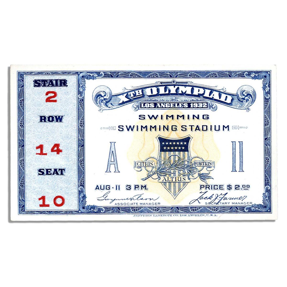 Ticket to Swimming at the 1932 X Olympics in Los Angeles -- Measures 4.5'' x 2.5'' -- Near Fine
