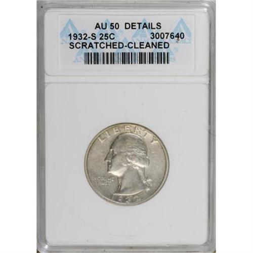 <B>1932-S 25C --Cleaned, Scratched--ANACS. AU50 Details.</B></I> NGC Census: (54/2042). PCGS Population (85/2936). Mintage: 408,000. Numismedia Wsl. Price for NGC/PCGS coin in AU50: $230. (#5792)<BR><BR><B>Coin Engraver:</B> John Flanagan<BR><BR><b>Shipping:</b> Coins & Currency (<a target="_blank" href="http://www.heritageauctions.com/common/shipping.php">view shipping information</a>)