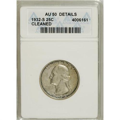 <B>1932-S 25C --Cleaned--ANACS. AU50 Details.</B></I> NGC Census: (54/2042). PCGS Population (86/2964). Mintage: 408,000. Numismedia Wsl. Price for NGC/PCGS coin in AU50: $230. (#5792)<BR><BR><B>Coin Engraver:</B> John Flanagan<BR><BR><b>Shipping:</b> Coins & Currency (<a target="_blank" href="http://www.heritageauctions.com/common/shipping.php">view shipping information</a>)