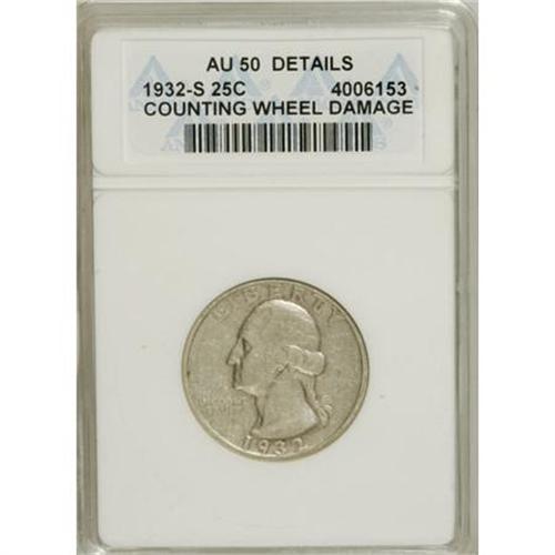 <B>1932-S 25C --Counting Wheel Damage--ANACS. AU50 Details.</B></I> NGC Census: (54/2042). PCGS Population (86/2964). Mintage: 408,000. Numismedia Wsl. Price for NGC/PCGS coin in AU50: $230. (#5792)<BR><BR><B>Coin Engraver:</B> John Flanagan<BR><BR><b>Shipping:</b> Coins & Currency (<a target="_blank" href="http://www.heritageauctions.com/common/shipping.php">view shipping information</a>)